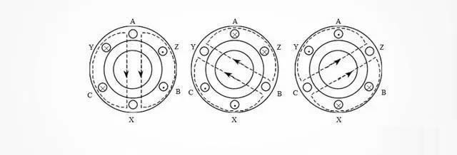 當(dāng)交流電相位θ=00 時,IA=0,IB爲負值,IC爲正值,此時,線端A、X沒有電流,繞組BY電流從(cóng)Y流進B流出,繞組CZ電流從(cóng)C流進Z流出 ,由安培右手螺旋定則得到圖(a)中的磁感線的方向(如虛線箭頭所示)。