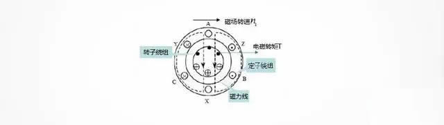由於(yú)旋轉磁場不斷切割轉子中的閉合導體 ,産生感應電動勢和感應電流,再由轉子中的感應電流和旋轉磁場的相互作用産生電磁轉矩,使得轉子随著(zhe)旋轉磁場的方向同向運轉。比如籠型異步電動機,由於(yú)旋轉磁場順時針切割轉子導體,相當於(yú)導體逆時針轉動,運用右手定則,讓磁感線垂直穿過手心,拇指指向導體的運動方向,四指的方向就是感應電流的方向(如圖4所示籠型異步電動機轉子繞組電流的方向),然後應用左手定則,磁感線穿過手心,四指指向電流運動方向,大拇指方向即爲轉子受到電磁力的方向(如圖所示電磁轉矩矩T方向),在電磁力的作用下形成電磁轉矩,拖動轉子順著(zhe)旋轉磁場的方向轉動。