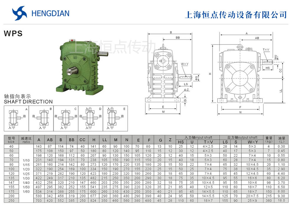 的外形尺寸及安裝尺寸,WPS減速機軸輸入,軸輸出.WPS減速機軸指向表示方法.機座号從40到250,可選速比從10到60.WPS系列蝸輪蝸杆減速機選型指南,選型方法