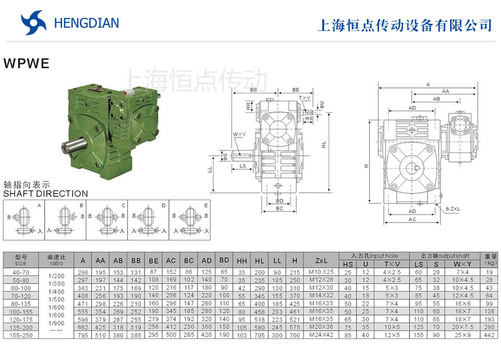 WPWE雙級萬能減速機的外形安裝尺寸.WPWE雙級蝸輪蝸杆減速機選型指南,WPWE雙級減速機軸輸入,軸輸出.WPWE雙級減速機軸指向表示方法.機座号40-70到155-250,速比200到900.